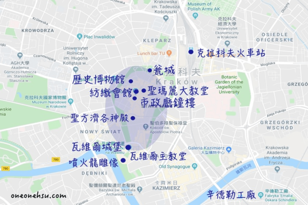 對大屠殺很有興趣的也可以到老城隔壁的卡齊米日猶太區 Kazimierz &猶太隔離區 Kraków Ghetto走走看看!還有辛德勒工廠Fabryka ‘Emalia’ Oskara Schindlera(都在上圖右下角)