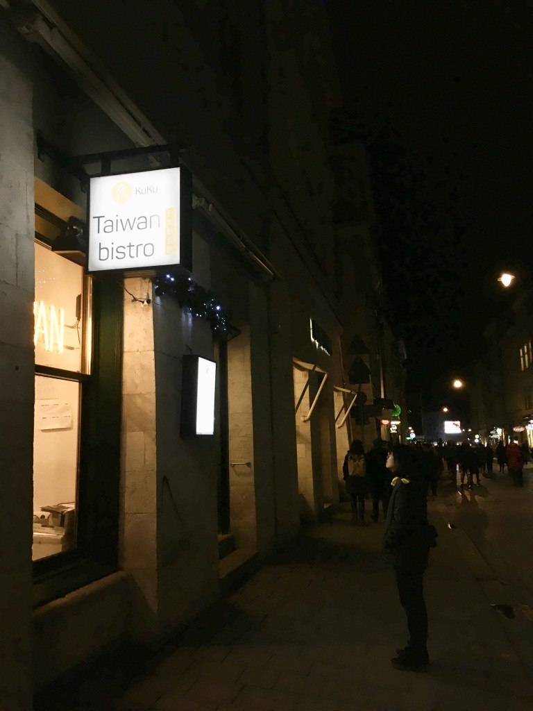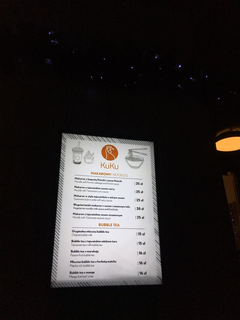 然後買完走到旁邊要吃,抬頭一看竟然是一家台灣餐館KuKu Taiwanese Food & Bubble tea!三個人馬上站在門口看菜單XD…..而且很巧也在門口遇到一樣是台灣人的一對學生情侶(他們還先聽我們講話確認是台灣人才跟我們搭話,真是可愛!)相認之後發現他們是來波蘭留學,一期一會!