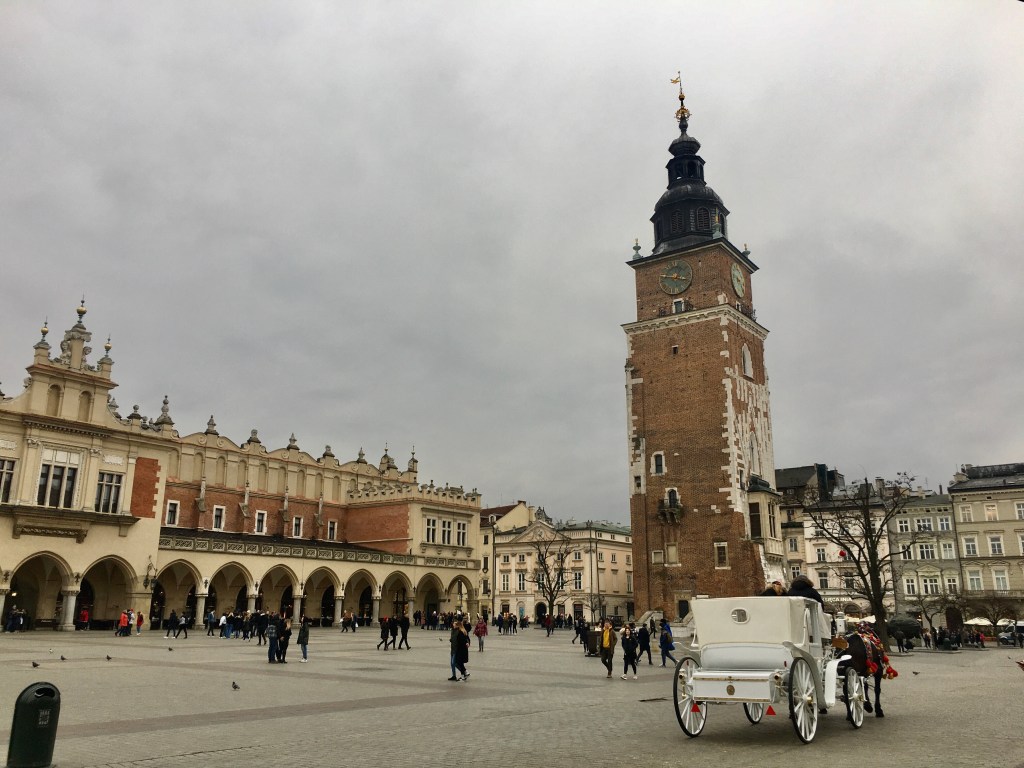 從城門走進來沒有停的話大概10分鐘內就會來到老城的主要廣場Town square(也叫做中央市集廣場Rynek Główny Market Square),是歐洲最大的中世紀主廣場,面積有40,000m²,紡織會館The Cloth Hall位於正中央,剛好將廣城分成不同區塊,一側為聖母聖殿St. Mary’s Basilica;另一側則有市政廳鐘樓Wieża Ratuszowa以及人頭雕塑Rzeźba Mitoraja等,多數主要景點都圍繞在廣場周邊。廣場上會有很多馬車,造型浮誇,也是一個看點。
