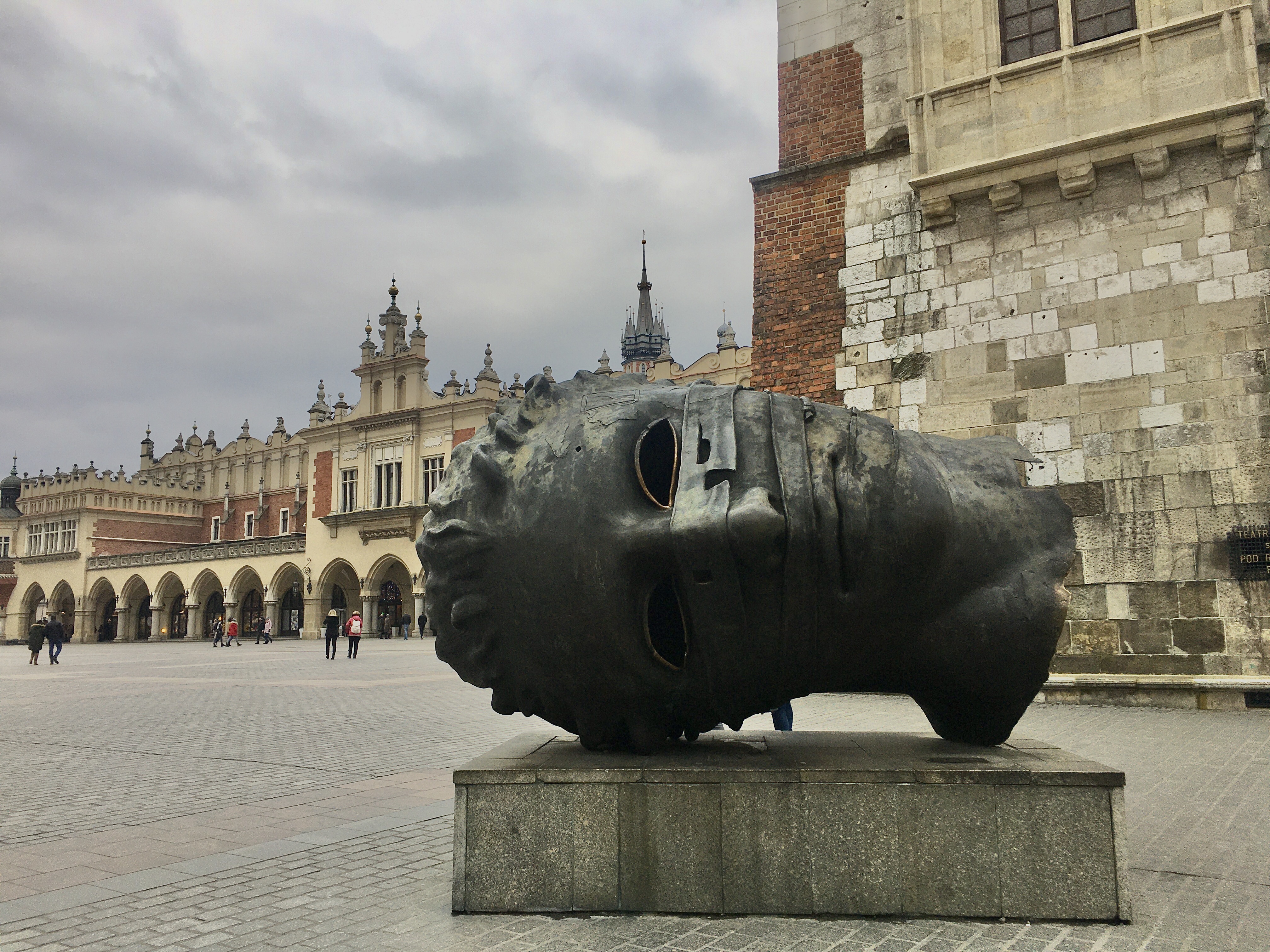 市政廳鐘樓腳下有一顆倒放的金屬人頭雕塑《Eros Boundato》乍看之下實在有點驚悚,是波蘭藝術家 Igor Mitoraj 的作品,他擅長重新詮釋古代藝術,引入後現代的元素,雕像破碎繃帶纏繞著眼睛跟嘴巴,象徵著愛神被慾望囚禁,當然也有其象徵的意義。(人可以進到雕像裡面)